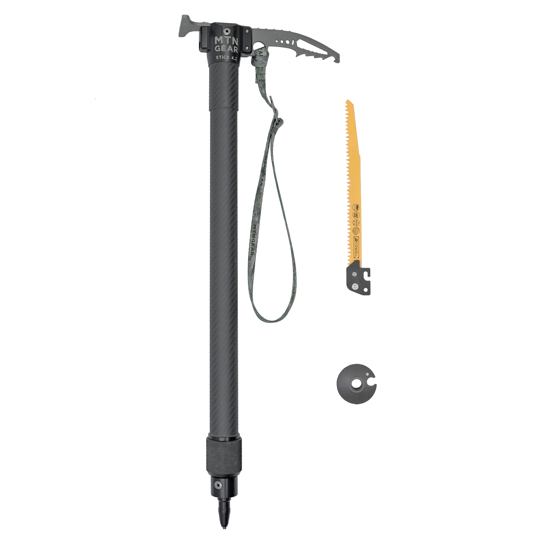 The Stick 4.2 includes an array of features giving you a highly functional and durable mountain tool. It can be used as a shooting stick, camera stabilizer, teepee center pole, tripod leg, a pick, saw, snow shovel and much more can be attached.